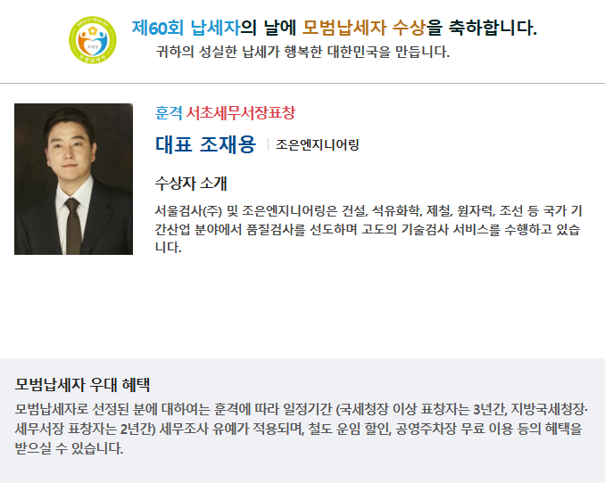 서울검사(주) 조재용 대표이사는 제60회 납세자의 날을 맞아 성실한 납세 의무 이행과 국가재정 기여 공로를 인정받아 서초세무서장 표창을 수상하였습니다.